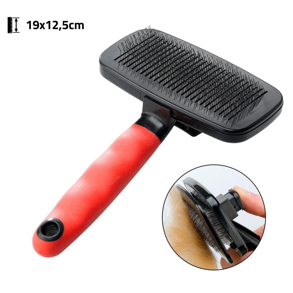 Cette brosse carde élimine parfaitement les poils morts de votre animal de compagnie grâce au poussoir permettant d'enlever facilement les poils de la brosse (bouton à l'arrière). Conseillée pour les animaux aux poils moyens et longs.