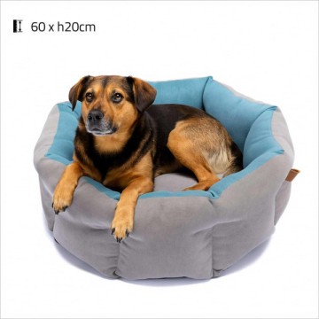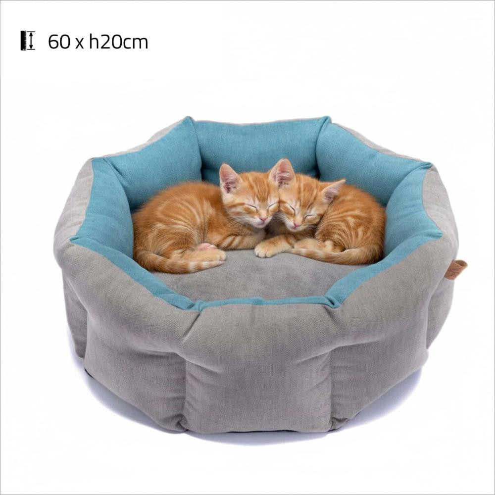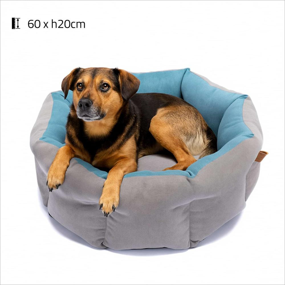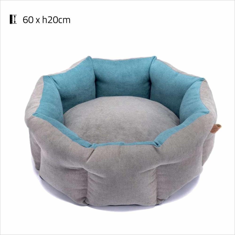 - Le panier Itaca est une corbeille ronde élégante et confortable pour chiens et chats, conçue en tissu bicolore gris et bleu turquoise.