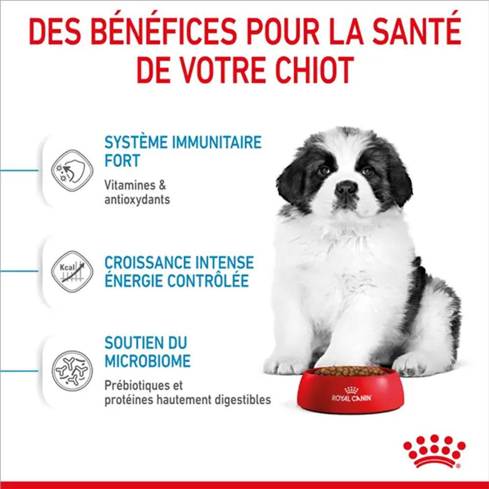- Les croquettes ROYAL CANIN® Giant Puppy sont enrichies en nutriments tels que la vitamine C et E pour aider les chiots à soutenir leurs défenses naturelles et favoriser le bon développement de leur système immunitaire encore immature.