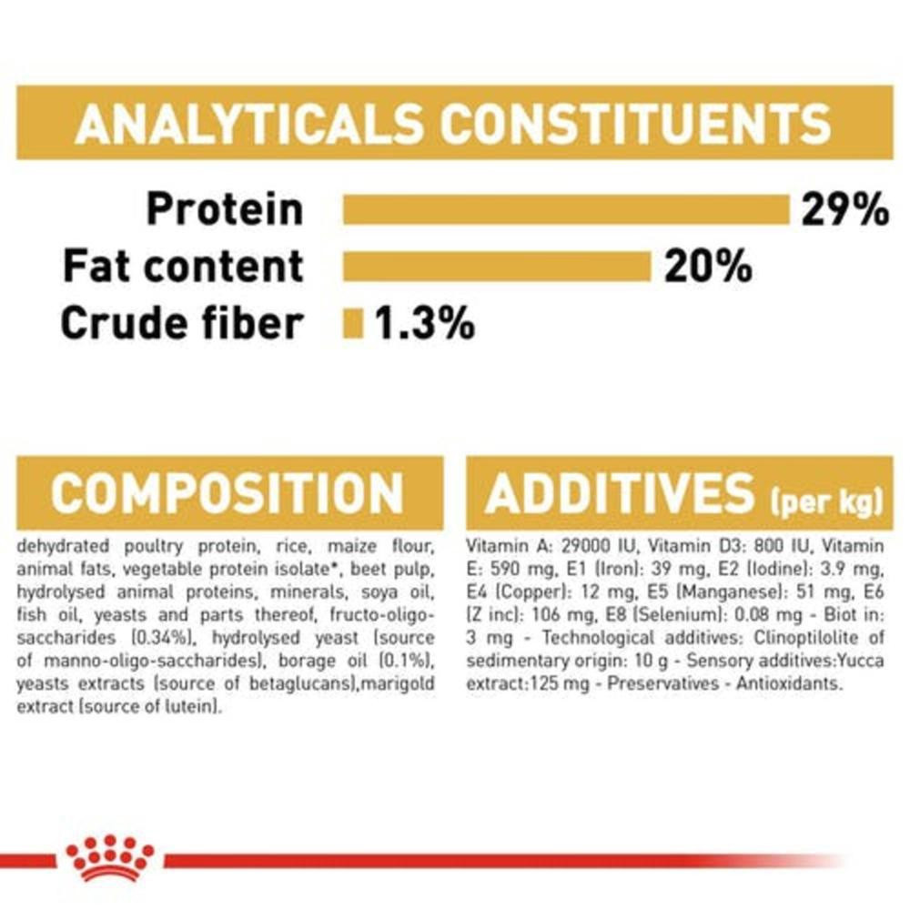 Composition : protéines de volaille déshydratées, riz, farine de maïs, graisses animales, isolat de protéines végétales*, pulpe de betterave, hydrolysat de protéines animales, sels minéraux, huile de soja, huile de poisson, levures et composants de levures, fructo-oligo-saccharides (0,34 %), hydrolysat de levures (source de manno-oligosaccharides), huile de bourrache, extraits de levure (source de bêta-glucans), extrait de rose d’Inde (source de lutéine).