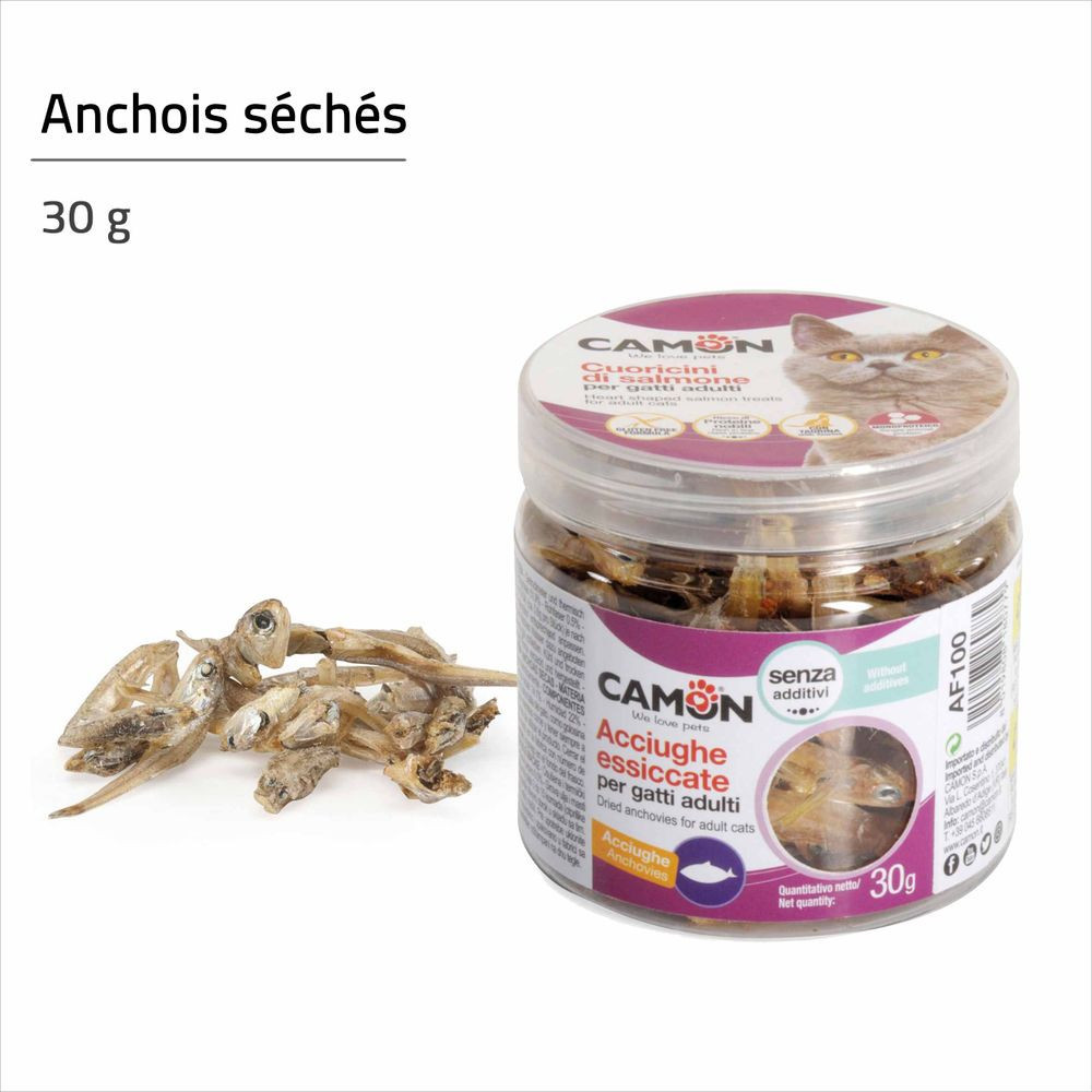 La friandise CAMON Anchois Séchés est une récompense naturelle et savoureuse, spécialement conçue pour les chats adultes.
