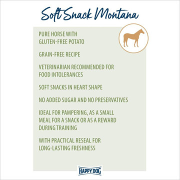 Offrez une pause gourmande à votre chien avec les Happy Dog Soft Snack Montana, des friandises tendres et savoureuses à base de viande de cheval, spécialement conçues pour les chiens sensibles.