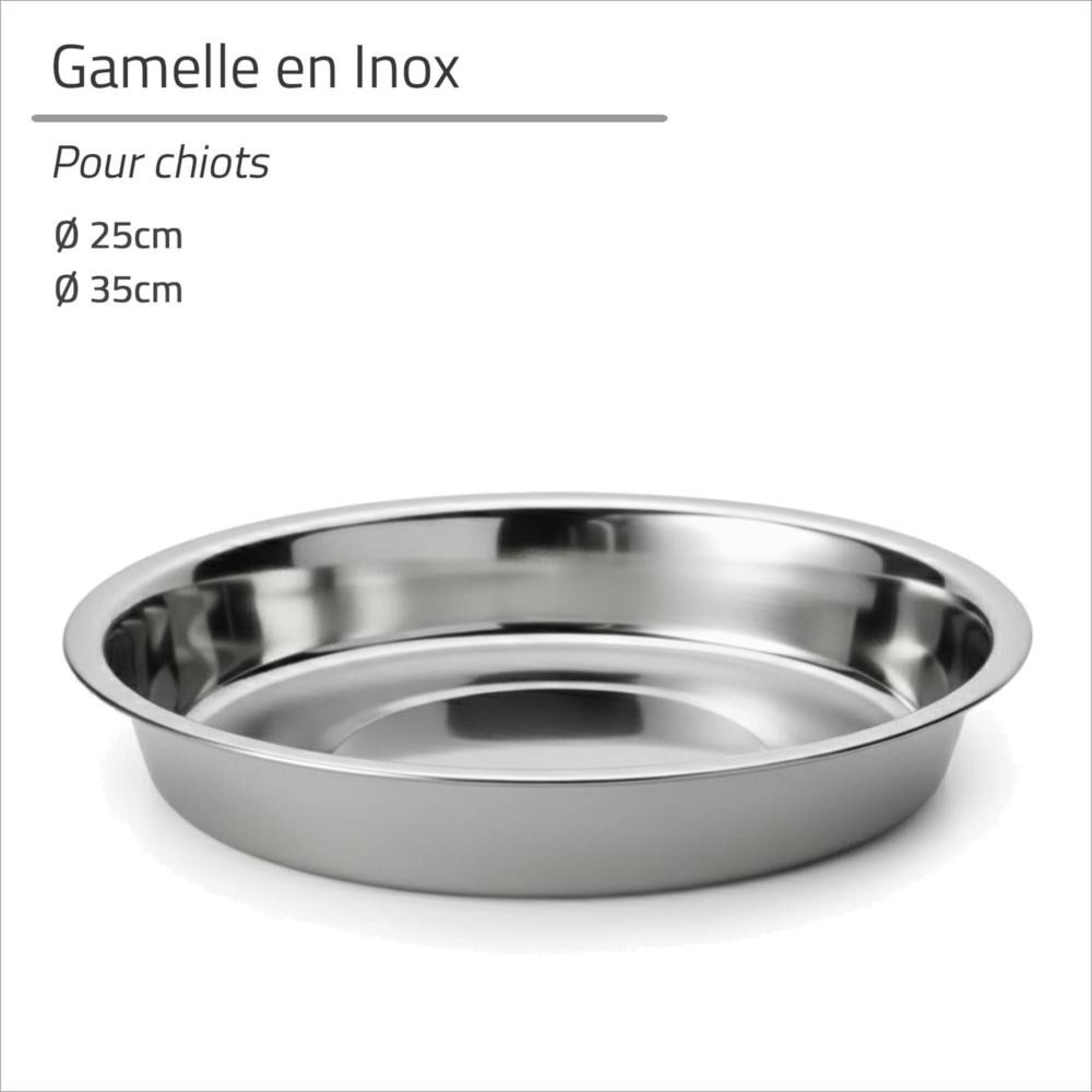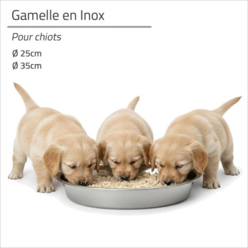Fabriquée en inox, elle combine légèreté, hygiène et robustesse. Grâce à sa surface large et basse, elle permet aux chiots de s’alimenter plus naturellement sans gêne, tout en limitant les débordements.