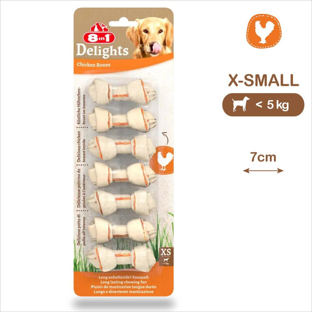 Les os 8in1 Delights Chicken Bones XS sont composés d'une savoureuse peau de bœuf et d'une délicieuse poitrine de poulet et offrent aux chiens miniatures de moins de 5 kg un effort de mastication agréable et de longue durée. Mais ce n'est pas tout : ils améliorent également leur hygiène dentaire. L'action abrasive naturelle de la mastication élimine le tartre, ce qui favorise la santé bucco-dentaire de votre chien. Pauvres en matières grasses, les os 8in1 Delights Chicken Bones XS constituent d'excellents produits à mâcher appétissants pour récompenser votre chien. Ils sont riches en protéines et sans colorant ni arôme artificiel. Par ailleurs, aucun sucre, OGM ou gluten n'a été ajouté à ces produits à mâcher cuits au four.