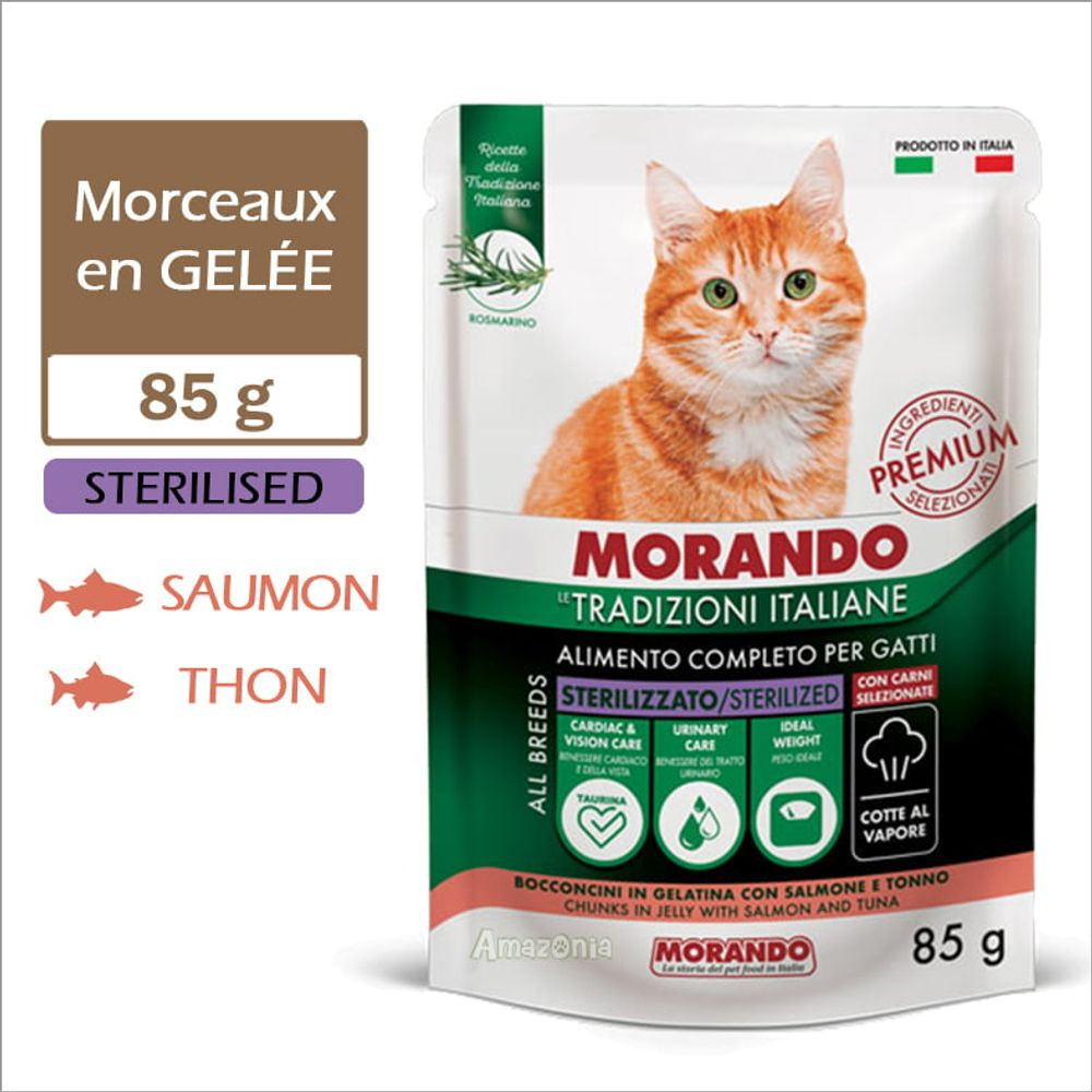 Offrez à votre chat stérilisé une expérience gourmande et équilibrée avec Morando Le Tradizioni Italiane Sterilized Cat bouchées en gelée au saumon et thon.