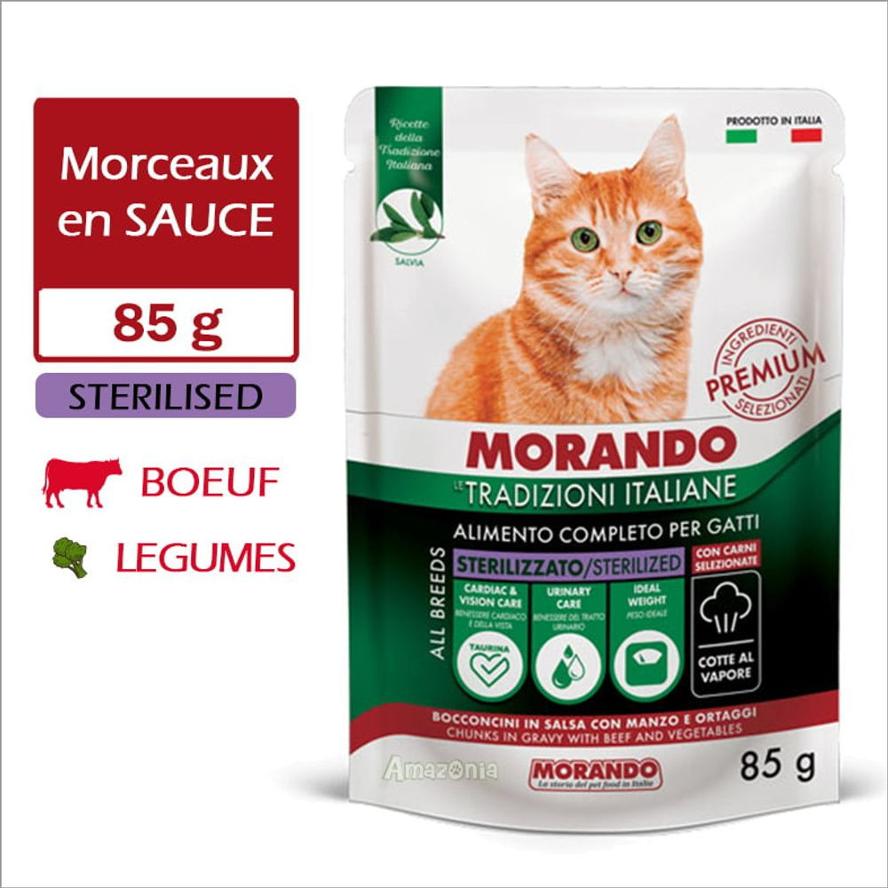 Offrez à votre chat stérilisé un repas savoureux et équilibré avec Morando Le Tradizioni Italiane Sterilized Cat – bouchées en sauce au bœuf et légumes.